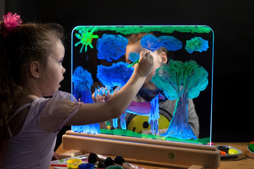 Víte, jak inovativně podpořit rozvoj kreativity vašich dětí již od útlého věku? Skvěle vám v tom pomůže i naše magická světelná tabule Jonely - inovativní novinka ve světě kreativy a nezapomenutelných zážitků pro všechny děti již od 3 let až po dospělost! Unikátní a exkluzivní magická světelná tabule vhodná pro kreslení barvami na malování, prstovými barvami, a křiklavými zvýrazňovači (součástí balení), zanechá na dětech nepopsatelné dojmy. Při tvorbě děti kreslí na tvrzené, barevně osvětlující se sklo, kde snadno a pomocí dálkového ovladače mohou měnit barvu a intenzitu jasu, také přepnout na jeden ze čtyř programů pro automatickou změnu barev a tlumení světla. Jonely Magická světelná tabule vám umožňuje zvolit si z rozsahu až 16 barev základního osvětlení a pokaždé vytvořit nové mistrovské dílo. Jiný dojem ze svého uměleckého díla dítě vytvoří jen jednoduchou změnou osvětlení. Nemusí proto okamžitě vymazávat své výtvory, když jen stačí změnit barvu a vychutnat si tak další silný zážitek. Osvětlení tabule se nachází uvnitř rámu a je pro dětičky velmi příjemné, jelikož nevyzařuje přímé světlo! Protože je Magická tabule vhodná pro kreslení z obou stran, dětičky si mohou kreativní díla vytvářet týmově a vyjadřovat tak své emoce a vzájemně se doplňovat a tím se učit empatii vůči svým kamarádům. Doporučujeme dokoupit ke kreativní tvorbě: barvy na malování, křiklavé markery (jsou součástí balení).